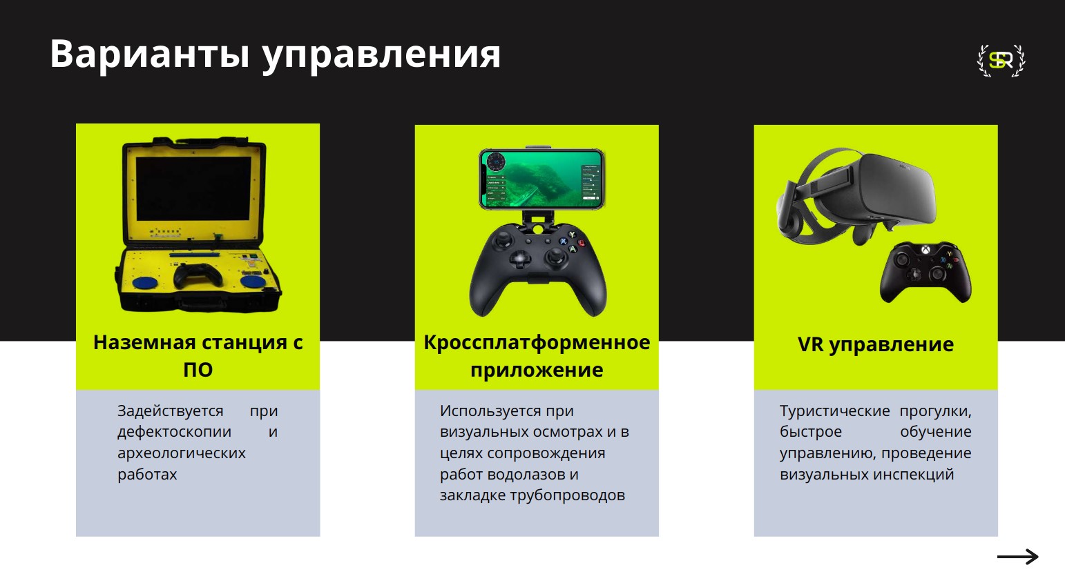 Конкурентные преимущества: Комплексы позволяют осуществлять автоматический поиск дефекта и его площадь и далее выводить его положение на карте объекта. Для первичного визуального определения дефектов применяется нейросеть, обученная на большой выборке изображений. Разрабатываемые подводные аппараты и программные решения для них имеют ряд плюсов, начиная с высокой манёвренности и заканчивая съемкой и разметкой 4K.