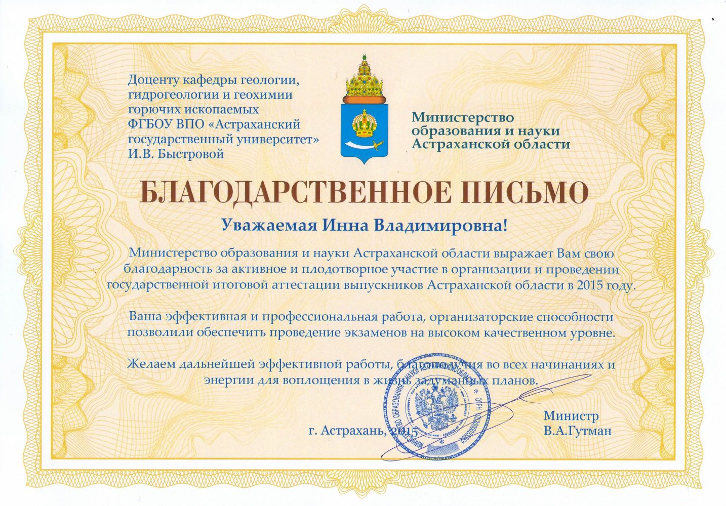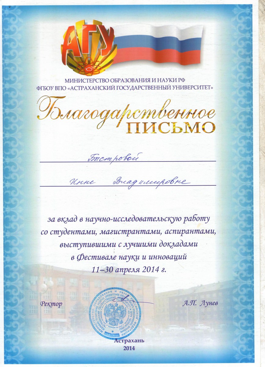 - Благодарственное письмо за активное и плодотворное участие в организации и проведении государственной итоговой аттестации выпускников Астраханской области.