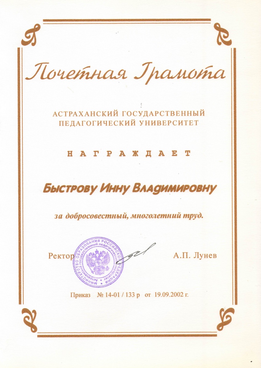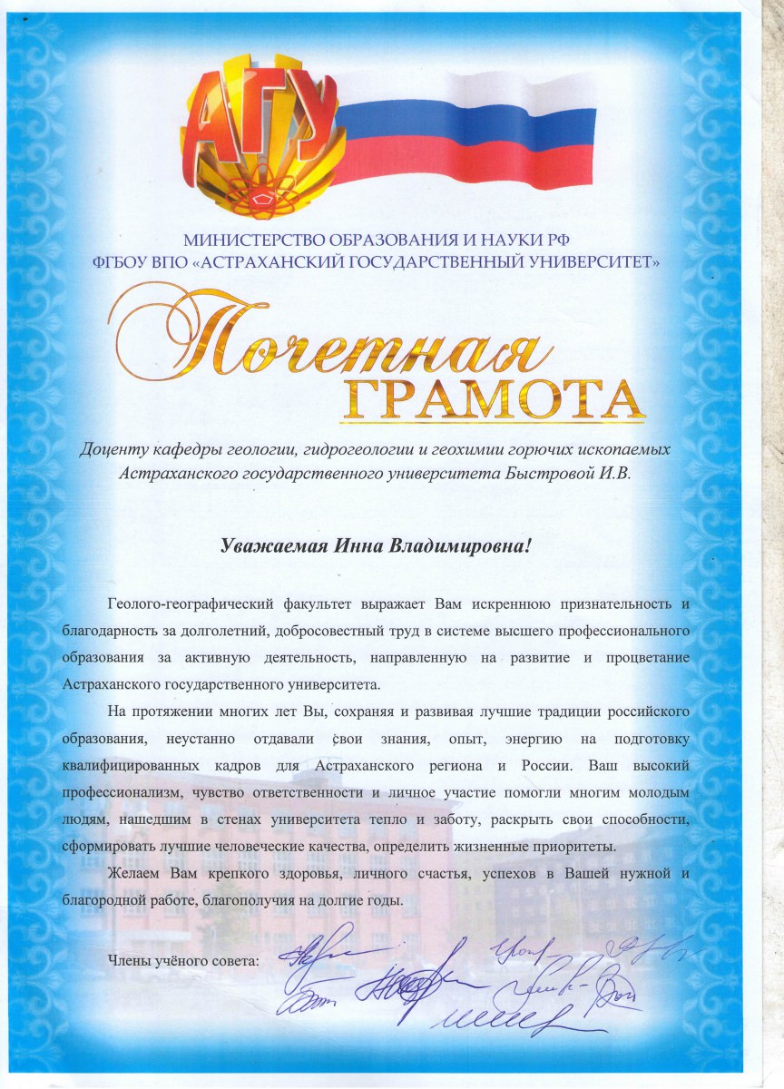 - Почётная грамота за долголетний, добросовестный труд в системе высшего профессионального образования, за активную деятельность, направленную на развитие и процветание Астраханского государственного университета.